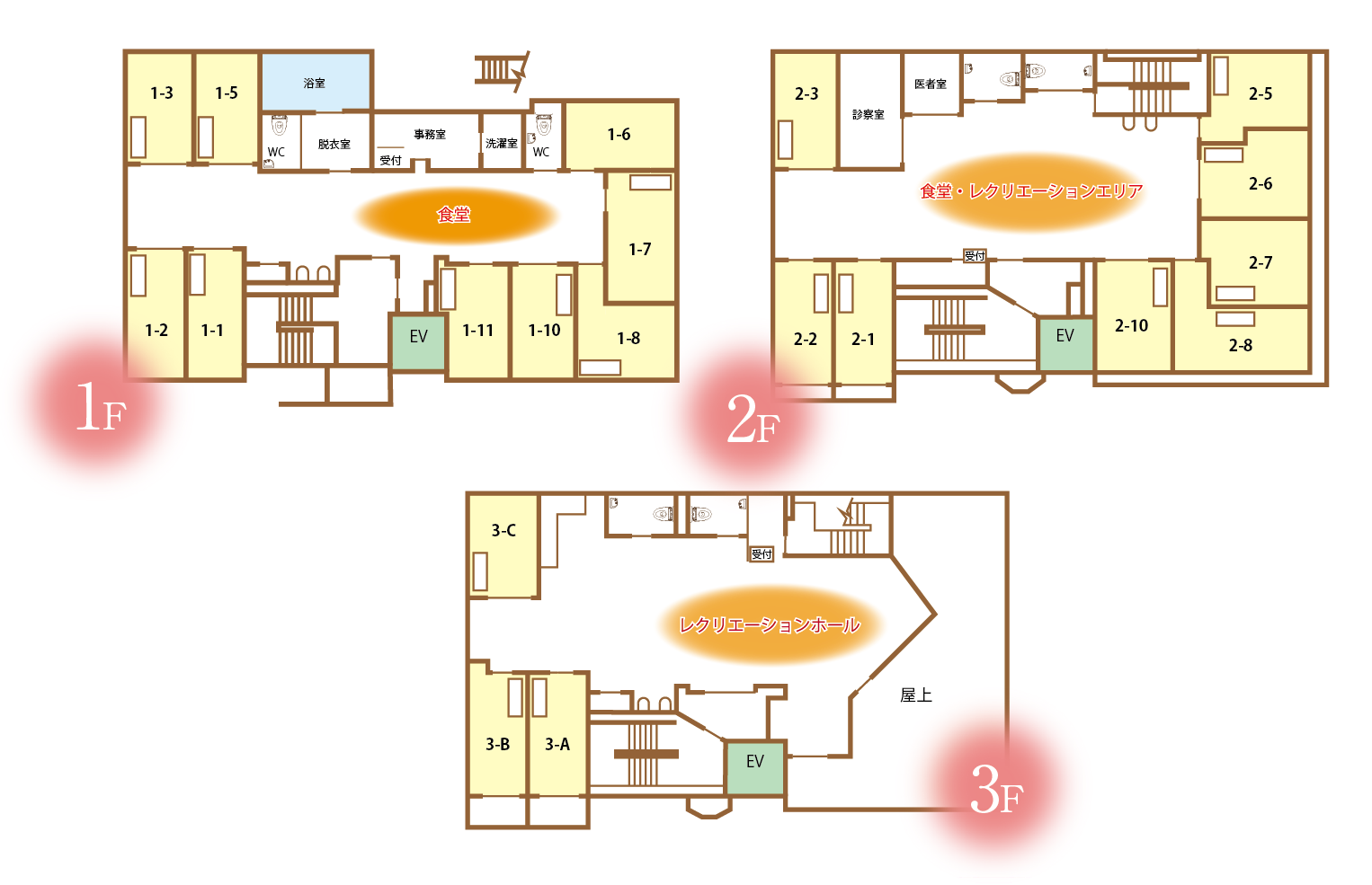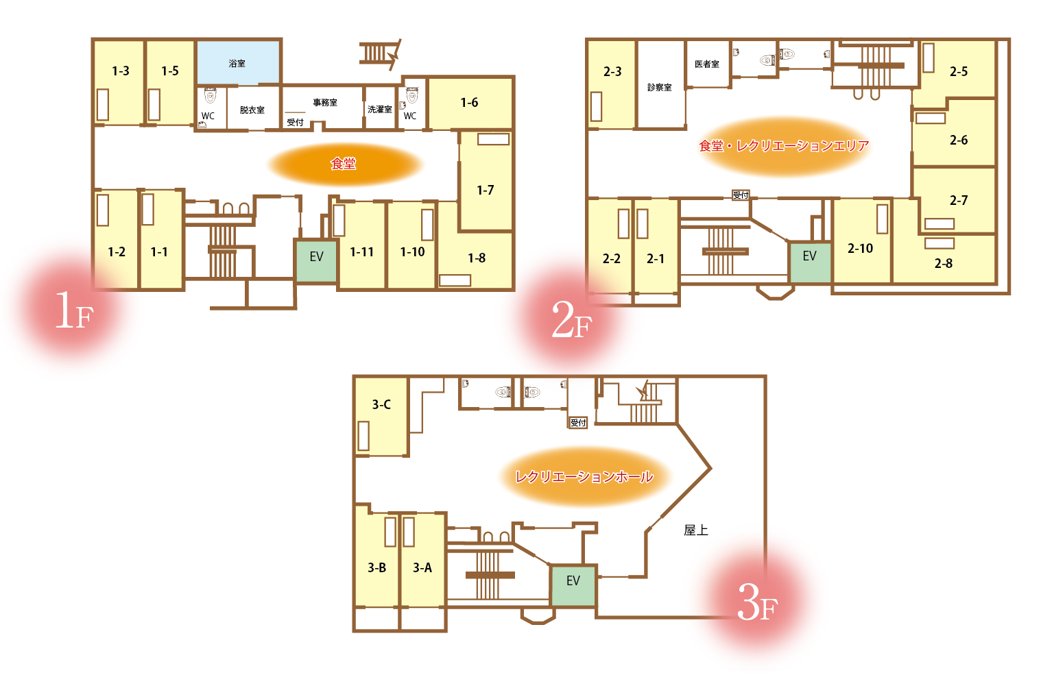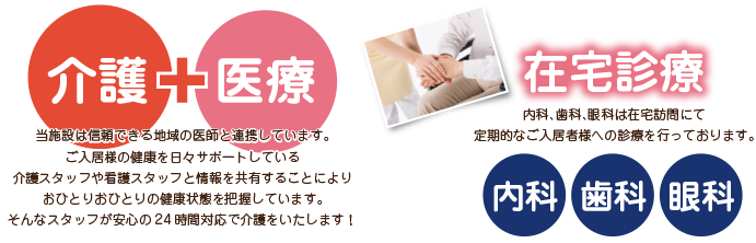 3階建、バリアフリー構造。車椅子をご利用の方でもエレベーターで各階に移動することが可能です。南向きの一日中暖かな施設内で、毎日を穏やかにお過ごしいただけます。また協力医療機関との連携により、ご入居者様の日常医療を確保いたしております。日中には看護師を配置し、夜間も常に看護師と連絡できる体制を整えておりますので、ご利用者さまにも安心して暮らしていただけます。