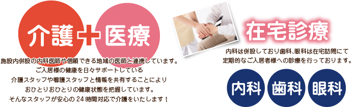眼科・歯科での在宅診療を行っておりますので、ケアタウン豊明の中にて内科・眼科・歯科の医療サービスの提供ができます。ケアタウン豊明は、一人ひとりのニーズに合わせたグレードの高いサービスを24時間365日連携で提供できる介護施設を目指しています。